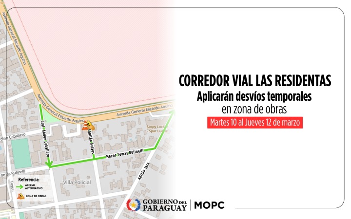 El Ministerio de Obras Públicas y Comunicaciones (MOPC) agradece la comprensión de los conductores por las molestias temporales ocasionadas, recordando que la intervención garantiza que el Corredor Vial Las Residentas sea una obra duradera, segura y de calidad.
