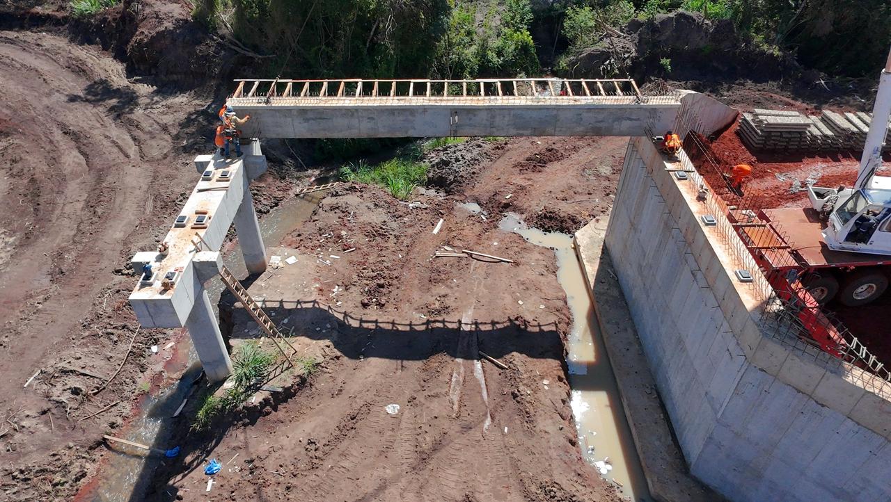 En el puente, de 30 metros de longitud y con vanos de 15 metros cada uno, se inició el montaje de las vigas longitudinales, que permitirán posteriormente asentar las losetas prefabricadas y preparar los encofrados para la carga final de la losa. Estas tareas forman parte de las obras de arte que garantizan la durabilidad y seguridad de la vía.