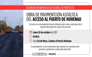 El Ministerio de Obras Públicas y Comunicaciones (MOPC) invita a la comunidad de Hohenau a participar de una reunión informativa sobre el proyecto de pavimentación del acceso al puerto Paredón, tramo que integra la denominada “Ruta de los Inmigrantes”, en el departamento de Itapúa.