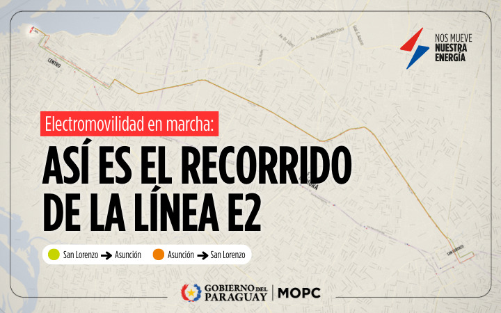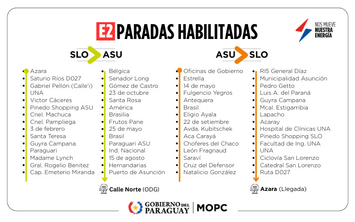 La línea E2 de buses eléctricos, que conecta San Lorenzo con Asunción, opera con un esquema de paradas fijas y debidamente señalizadas a lo largo de todo su recorrido, destinadas al ascenso y descenso de pasajeros. Este sistema permite optimizar los tiempos de viaje y contribuye a una operación más eficiente del servicio de transporte público.