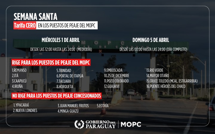 Según lo dispuesto, se aplicará tarifa cero en todos los peajes del MOPC el miércoles 1 de abril, de 12:00 a 24:00, y el domingo 5 de abril, de 00:00 a 24:00. En tanto, los días jueves, viernes y sábado santo se mantendrán las tarifas vigentes.